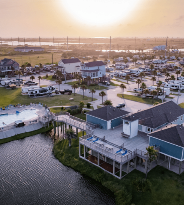 Stella Mare RV Resort located in Galveston Texas offers various accommodations, from pull-thru and back-in RV sites to beachfront vacation home rentals. Enjoy amenities like a heated outdoor pool, splash pad, multi-activity playground, and the soon-to-come tiki bar!